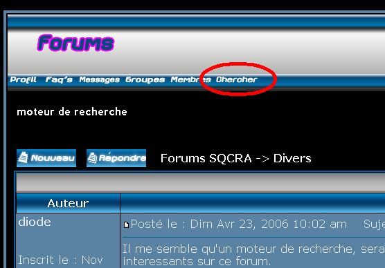 Il me semble qu'un moteur de recherche, serait utile pour trouver plus facilement les messages nous interessants sur ce forum.