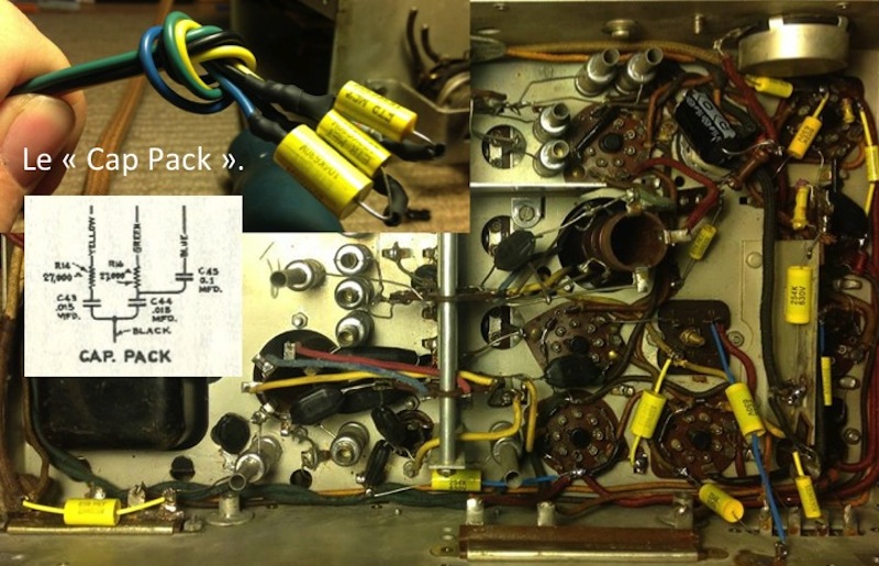 j'suis pas mal fier. surtout pour le "Cap Pack", composé de deux résistances et trois condensateurs. J'ai remis le tout dans la boite de métal se trouvant au dessus du châssis, après avoir enlevé la vieille matière noire et isolé avec du gros carton épais.