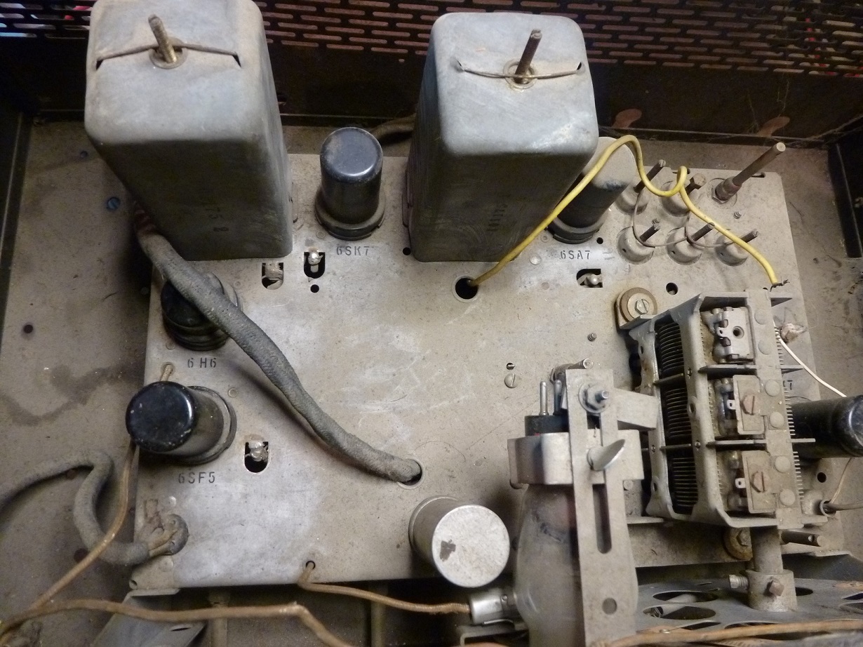 Voici une photo du mien, de toute évidence ce n'est qu'un syntonisateur, les tubes sont 6SK7 ampli RF, 6sa7 oscillateur/mélangeur, 6SK7 ampli IF, 6H6 démodulatrice et 6SF5 pré ampli audio.