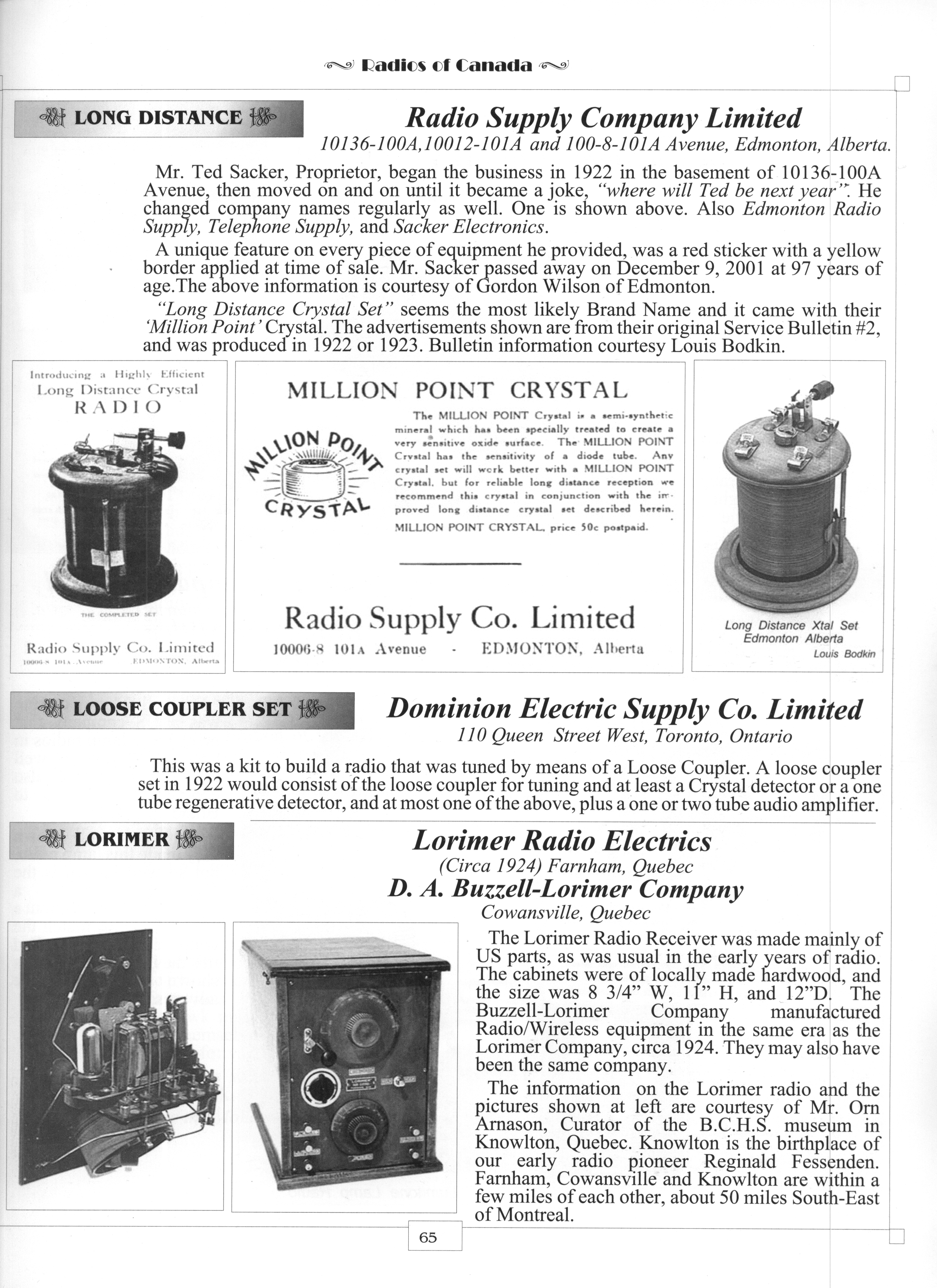 Je suis à la recherche d'un schéma pour un radio type TRF du fabricant : Lorimer Radio Electrics, Farnham, Que. A ce jour, les seuls renseignements que j'ai dénichés sur l'internet sont que le fabricant pourrait être une certain Albert J. Lorimer, gérant du traffic de la télégraphie de la Division St Lawrence au 243 MacKay St, Montréal Qué, une branche du réseau de radio-amateur ARRL en 1923. Ces lettres d'appel étaient: 2BF. Tous renseignements supplémentaires sur ce radio et sur ce fabricant québecois qui hélas n'existe plus, seraient les plus appréciés Cordialement. Daniel