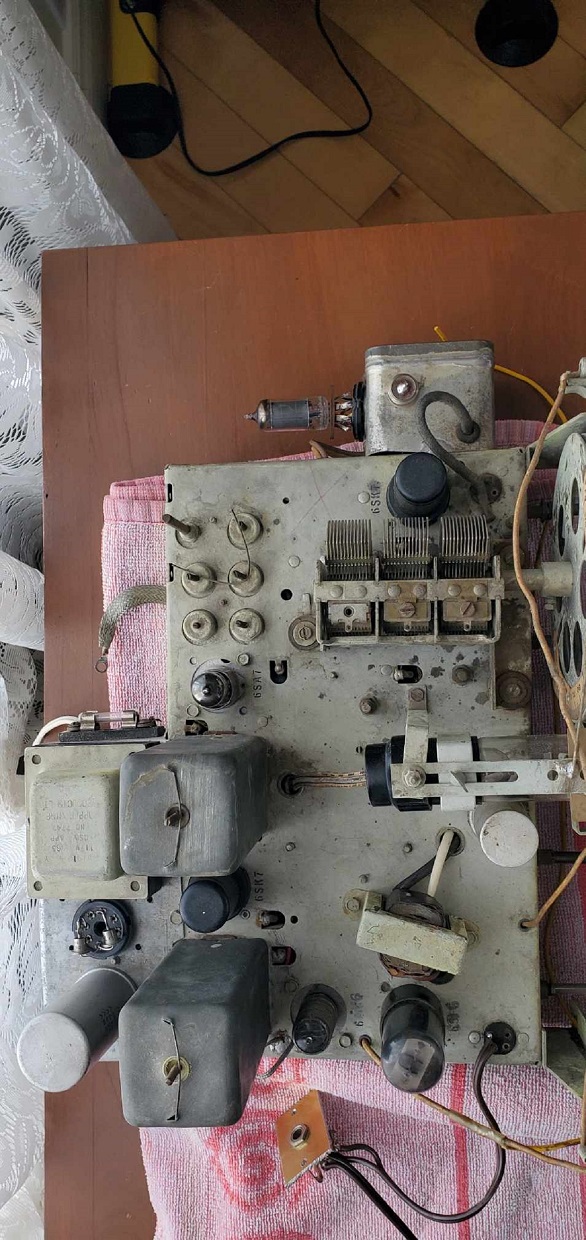Voici une photo du chassis du S.R.E. type 457 du musée. Lui aussi a été un peu trafiqué. Il devait être, à l'origine, utilisé en association avec un autre appareil identifié comme M/G selon la plaque d'identification. Le chassis de base est le même que l'A25 mais avec deux lampes additionnelles, une 6SF5 et une autre 6K6 pour une sortie push-pull. Je ne sais pas si l'ajout au chassis avec les deux transformateurs est d'origine. Le haut-parleur est externe et manquant. J'espère que ça peut t'éclairer un peu.