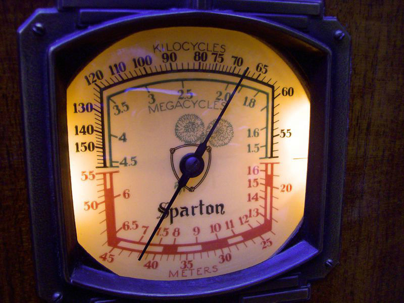 Pour l'échelle des ondes courtes... on doit aussi la multiplier par dix, mais même si on l'inverse, les chiffres n'arrive pas à la bonne place. Par exemple, 1.8 Mhz donne 166 m. En inversant le cadran on obtiendrait environs 120 m pour 1.8 Mhz, donc encore là ça ne fonctionne pas tout à fait.