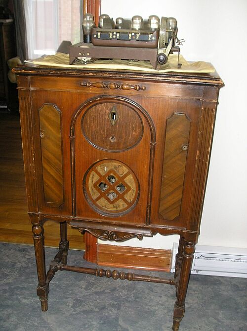 Cette semaine j'ai trouvé dans une brocante un radio High boy des années 20. Le cabinet en bon état, en regardant vite je vois à l'intérieur ce qui me parait être un châssis de Radiola 16 à batterie, il y a énormement de place pour mettre des batteries dans le cabinet.