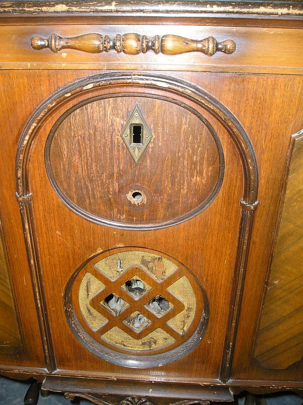 Salut Daniel, ce radio me semble trafiqué. La pièce de bois dans la partie supérieur ovale ne me semble pas original. L'écusson n'est même pas centré sur le radio, et les deux trous dans les motifs latéraux ne font pas sérieux. Le chassis original de ce radio a sûrement été changé et adapté à ce cabinet. Je crois que tu devrais chercher ce model chez un autre fabriquant.