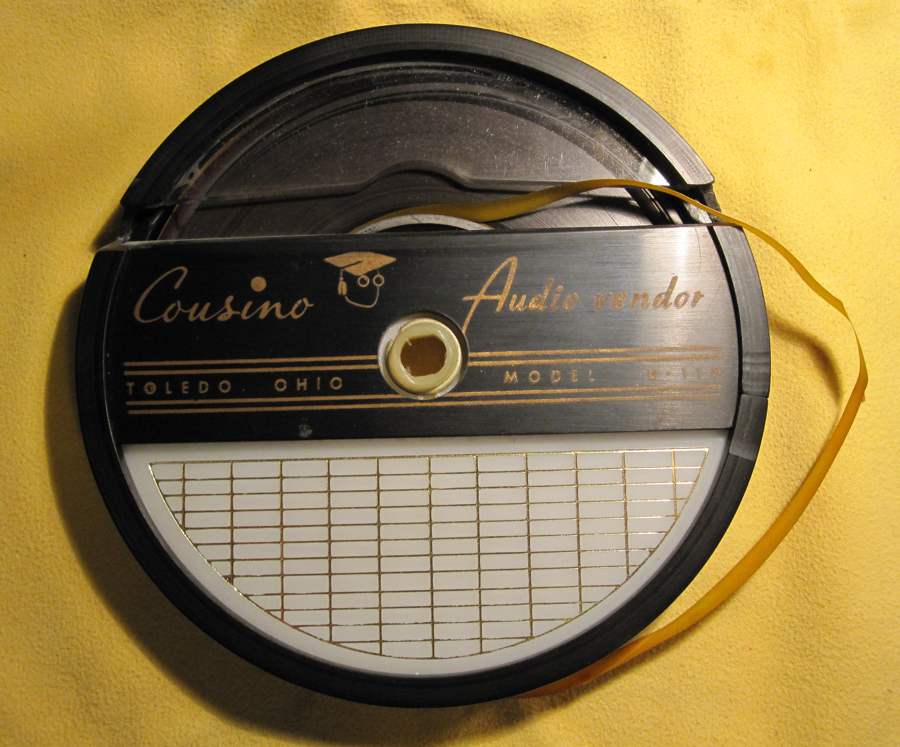En fait je n'ai pas trouvé la fameuse cassette mais j'ai tout de même eu la main heureuse sur Ebay pour quelques dollars. J'ai eu une bobine "Audio Vendor" manufacturée par le même Cousino. Bernard Cousino avait créé un ruban sans fin qui pouvait jouer un message et recommencer automatiquement au début. Ma bobine dure 30 minutes. Ce type de bobine pouvait être placée sur n'importe quel magnétophone ordinaire et jouait pour ainsi dire à l'infini. Par la suite il a trouvé comment mettre cette bobine dans une cassette... ce qui me reste encore à trouver!!!