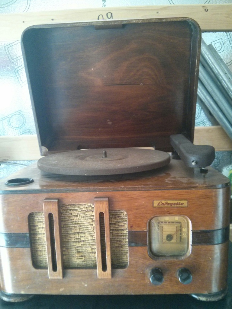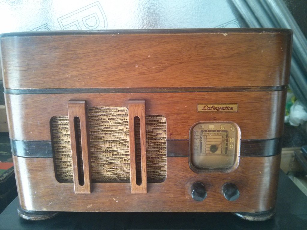 Je viens d'acheter un radio AM Superheterodyne en bois Lafayette. Il est a tubes et il a une table tournante 78 tours sur le dessus. C'est un radio de table pas très gros. Il n'y a aucune plaque d'identification. J'ai des photos en attachement.