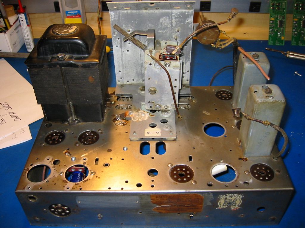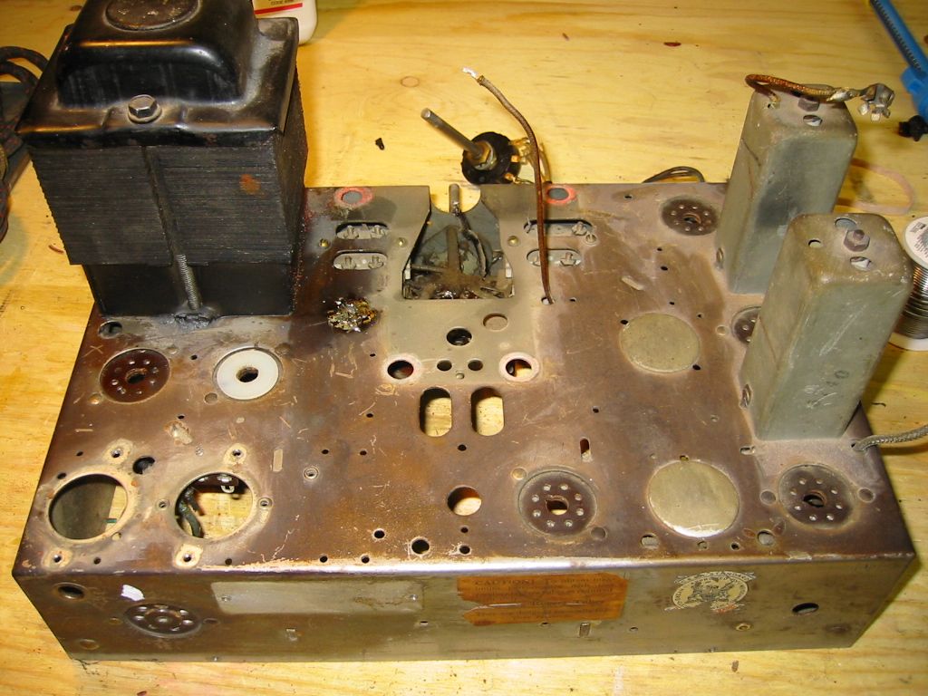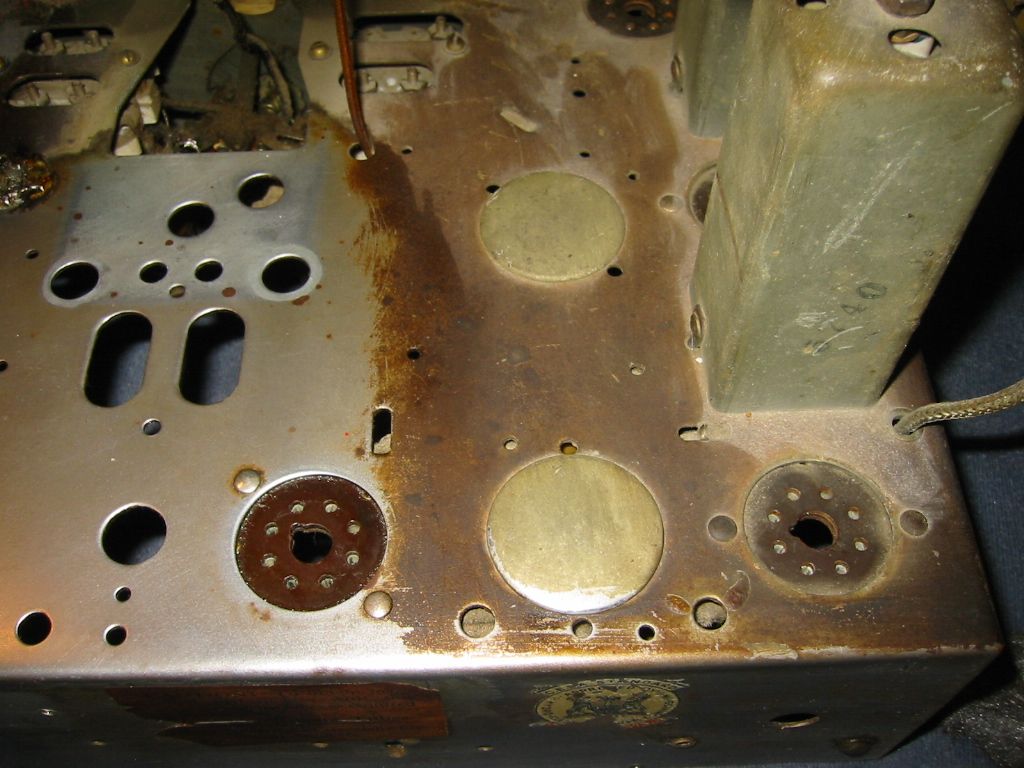 Celà va dans le sens que je pensais; un polissage. Le chassis n'au aucune rouille, juster terni. Tu as des photos d'un chassis remis à neuf. J'aimerais avoir une référence. Voir ce que à l'air l'intérieur d'un vieux radio remis à neuf. Ce qui est un peu dommage du Rogers, c'est que les tubes sont, pour la plupart, recouvert de métal. Celà enlève de l'éclat. C'est beau un tube tout brillant!!!