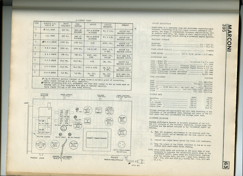 Pour ce qui est du schéma, je suppose que quelqu'un ici pourrait te le scanner dans son livre du Radio College of Canada pour ces années-là, en admettant qu'il s'y trouve (c'est probablement le cas puisque Marconi est canadien. Je ne suis juste pas certain pour l'année).